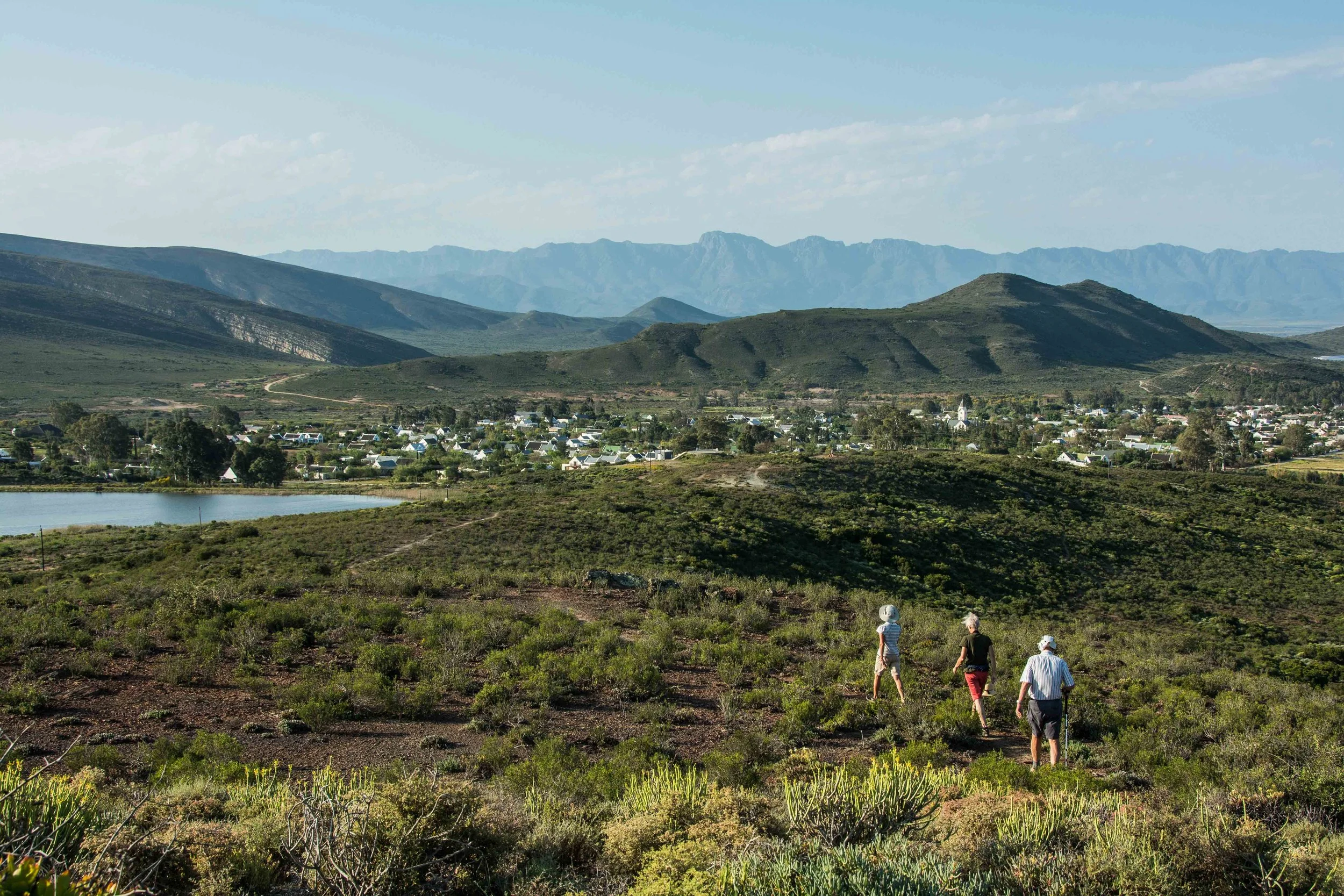 16.     Barbara leading us homeward. The view over MacGregor from Koffiekop, with the dam on the left of the picture.