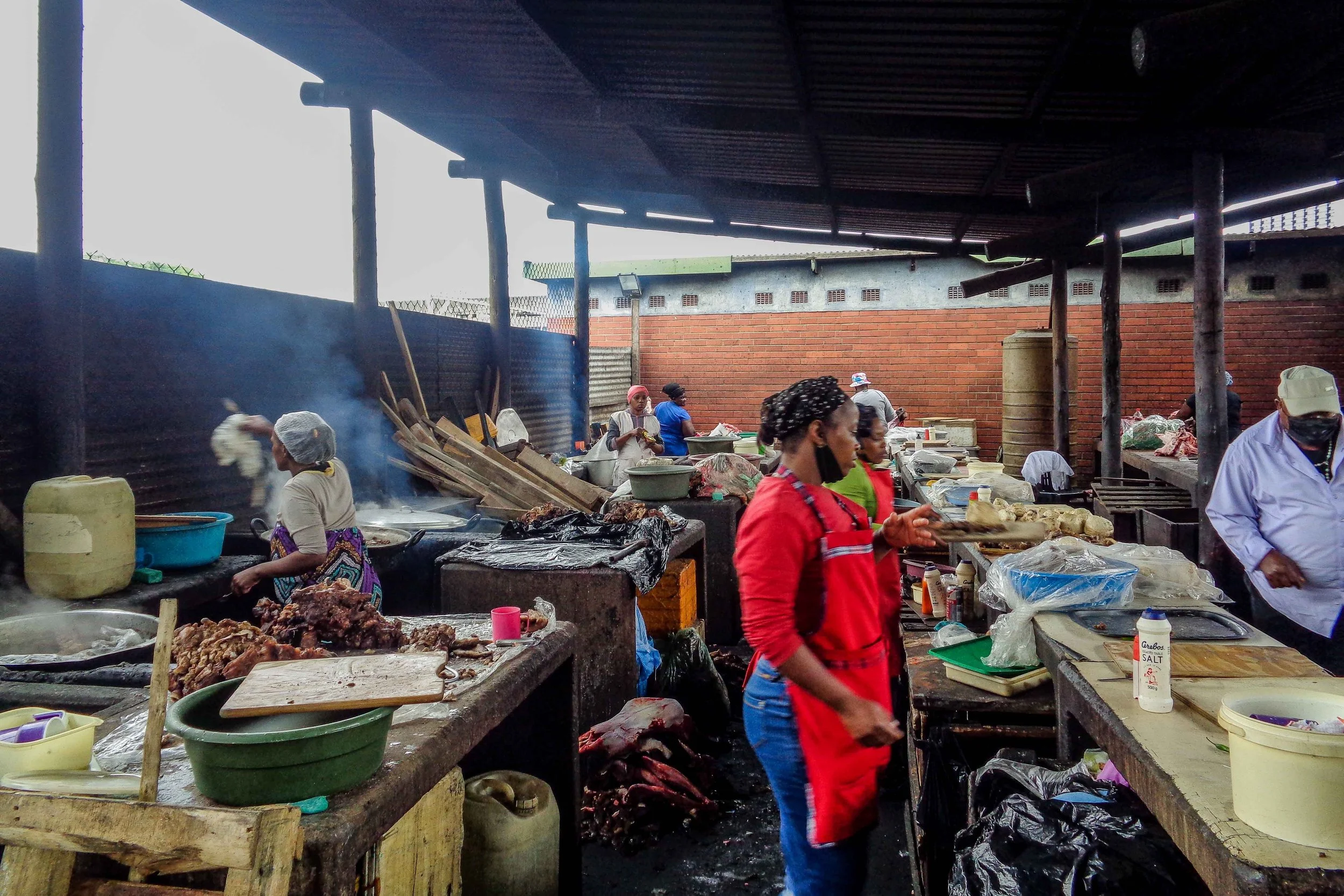 One of the more interesting, sociologically, activities is the cooking of bovine heads. Traditionally cows’ heads were cooked by and eaten by men. These were cooked on the pavement, but now a covered area for the cooking has been built, giving protection from the weather and improving the food hygiene. The cooks now are women, a break with tradition, but only men sit down to eat there. Women can buy takeaways, but not eat there.