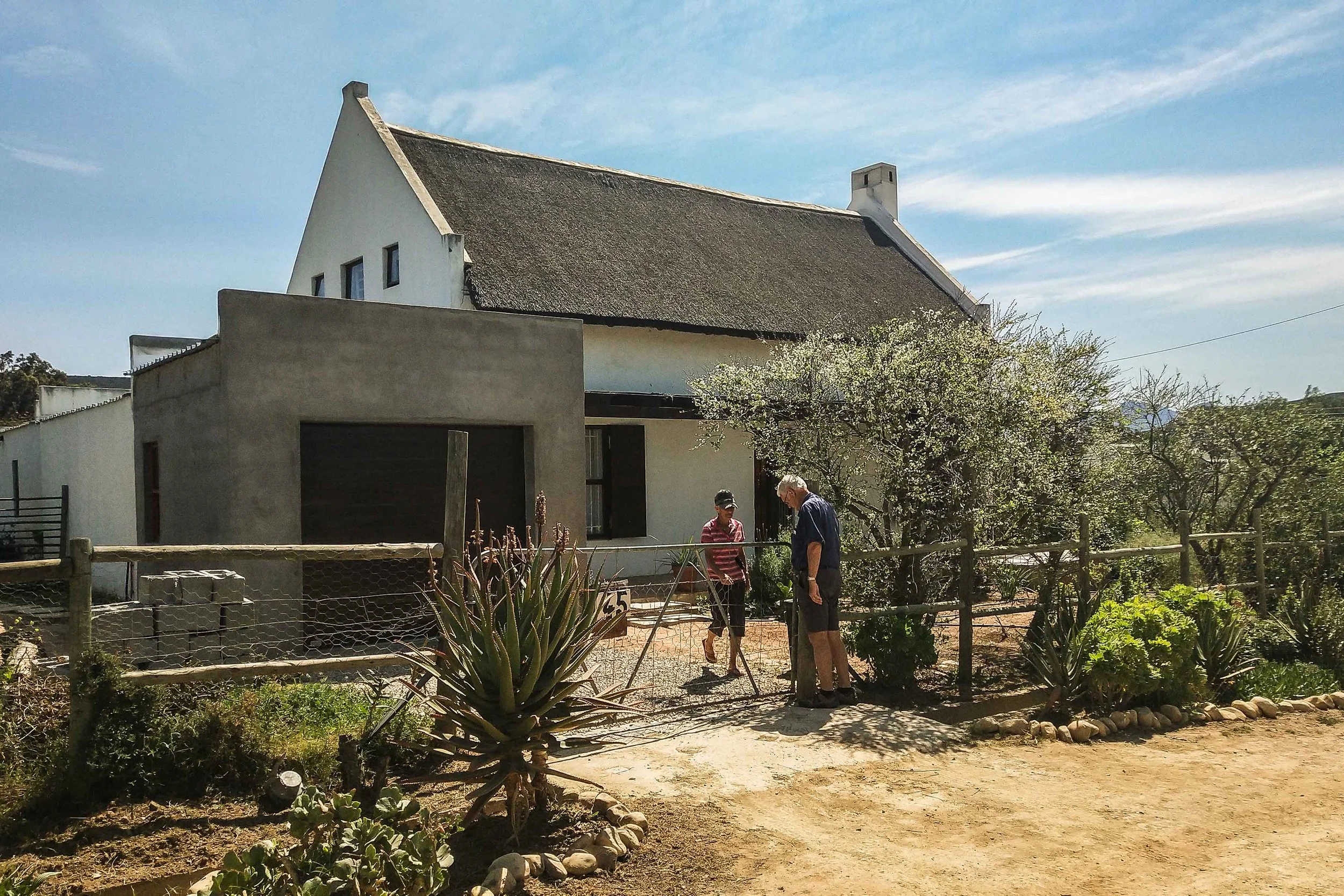 3.     Barbara and Martin inspecting their front gate for any defects. They have already extended the garage, the grey cement on the left, soon to be painted.