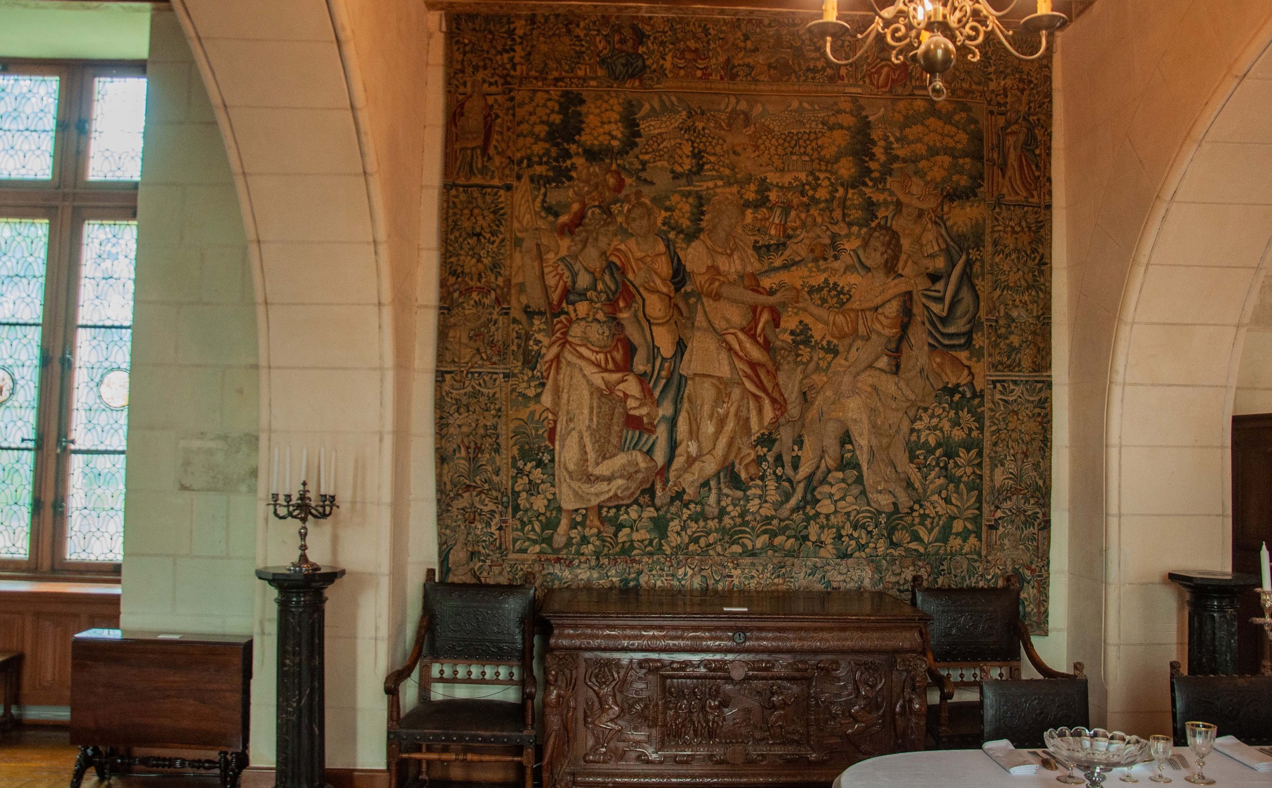 The chateau is also known for its tapestries. These are big, covering whole walls with detailed representations of biblical scenes and events in history.