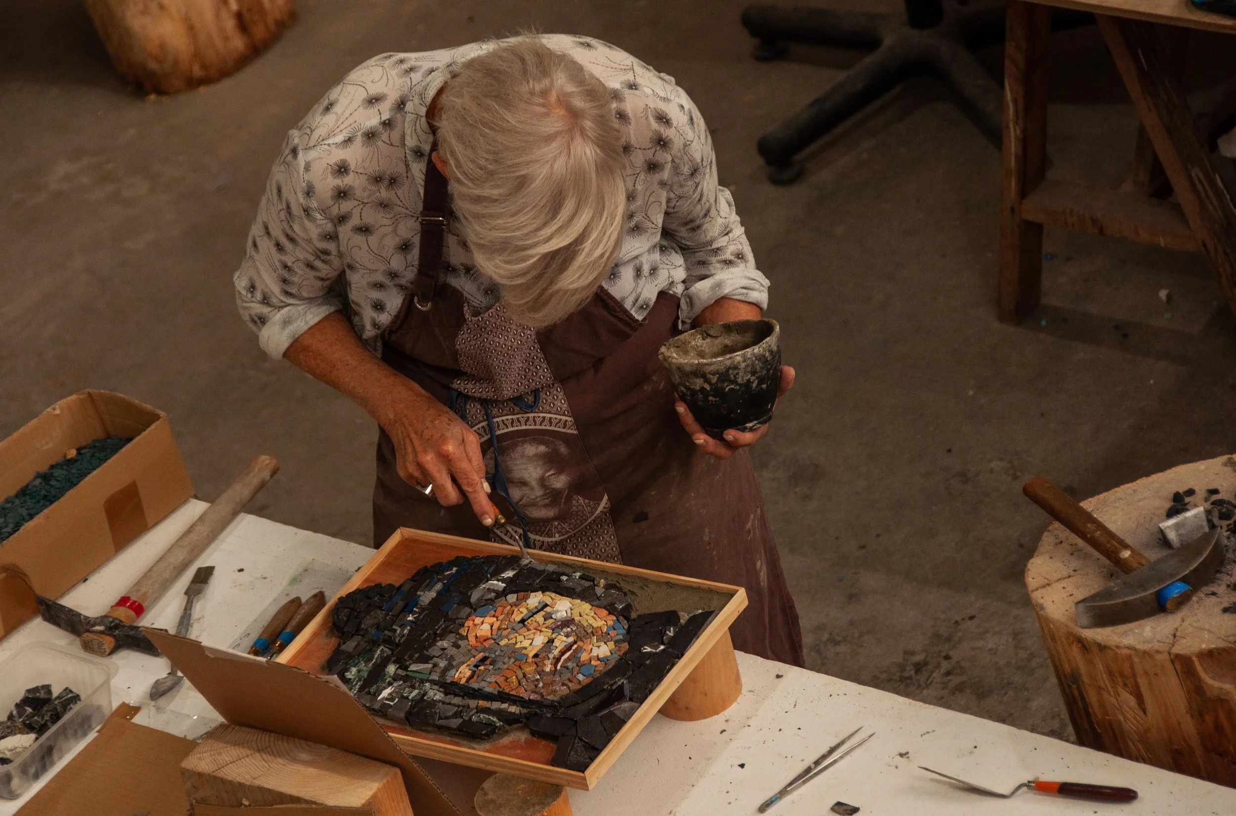 Ursula was learning a new technique using a sharp-edged hammer and a wedge shaped metal anvil to produce the pieces needed for her mosaic.