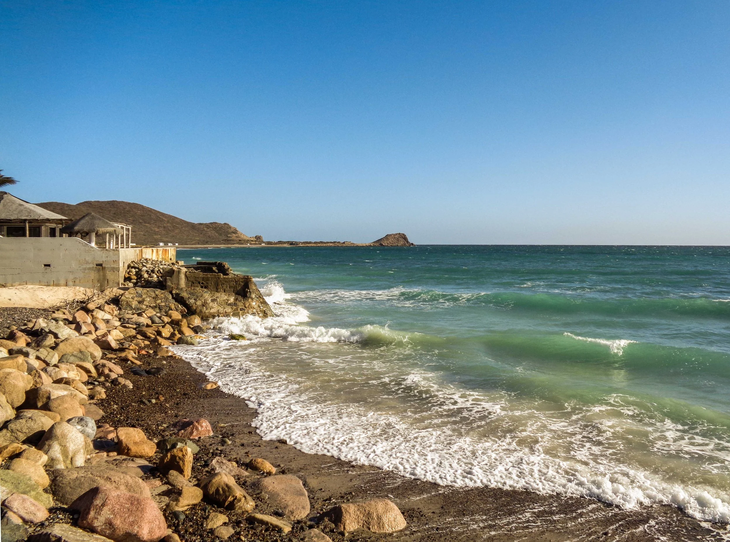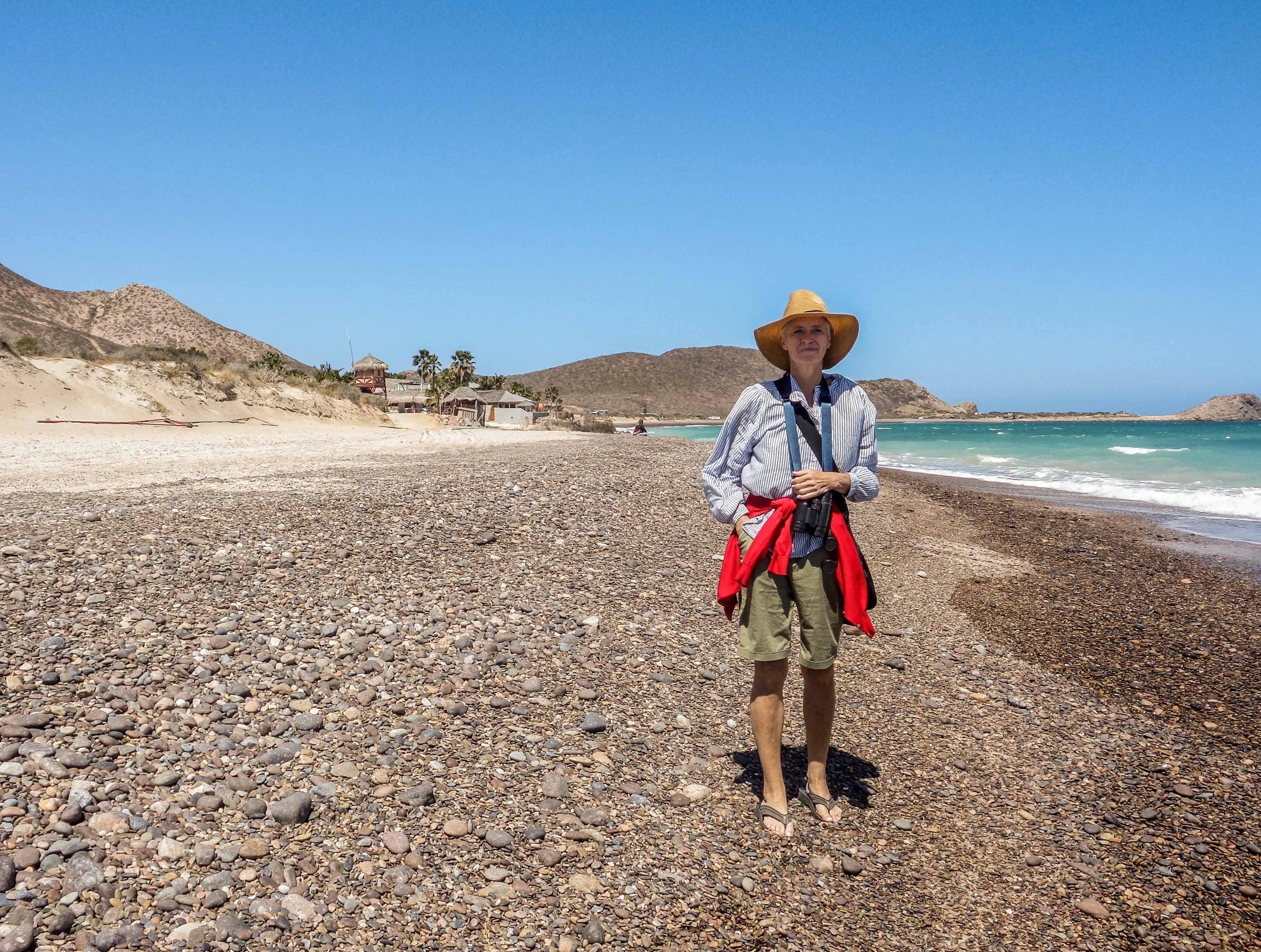 The coast line on the Gulf of California side of the peninsula, at least in the southern Baja, is very stony. The soils are soft, almost sandy, and easily eroded, and the stones are washed into the sea all along the coast. This makes walking uncomfortable in parts, but the stones are mostly confined to the water’s edge, with white sands behind them.