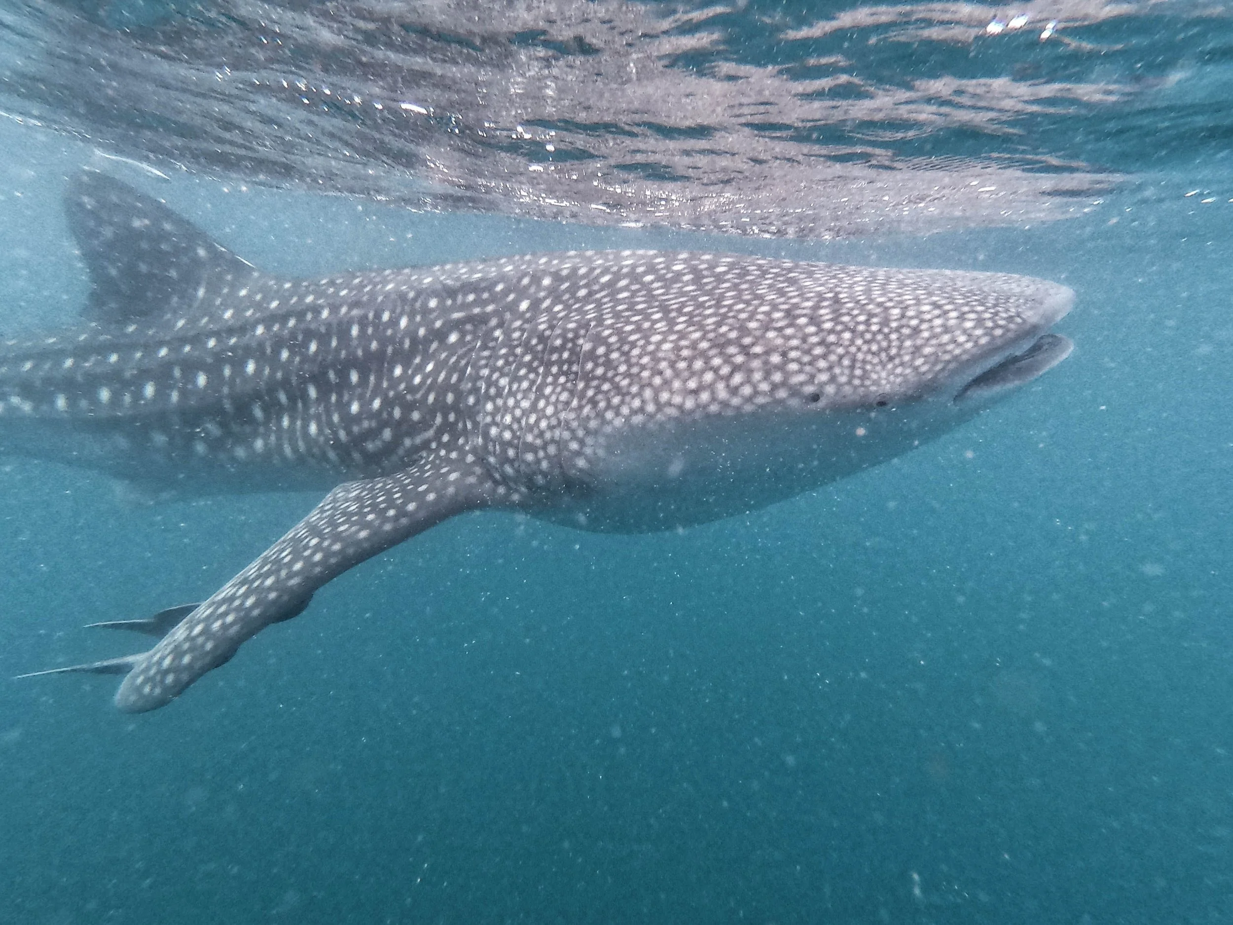 We do not have underwater cameras so we were reliant on the photos taken by our dive guide. We took it in relays to dive with the whale shark. Our boat would travel ahead of the shark and then 2 or 3 of us would enter the water and wait for the whale shark to arrive.  “Our” shark was not that big, probably around 6 metres, but they grow much bigger. They move much faster than expected from the lazy waving of their tales, and even with maximum exertion it is not possible to keep up with them for more than a few metres.