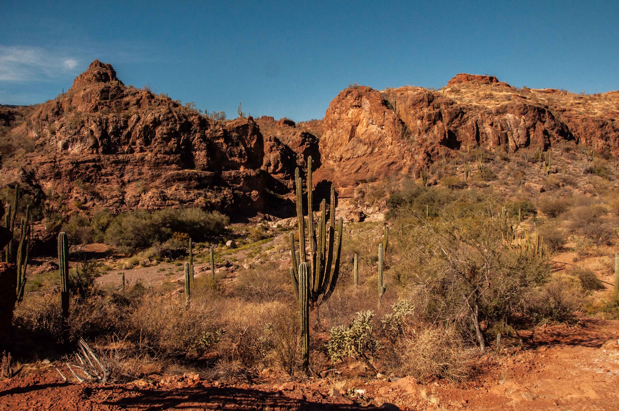 But that was the coast. The interior was dry; even by the standards of the rest of the Baja, it was dry. And where it is dry there is cacti in abundance. We both loved this countryside; there is little vegetation between the cacti, but it has spare beauty that we both appreciated.