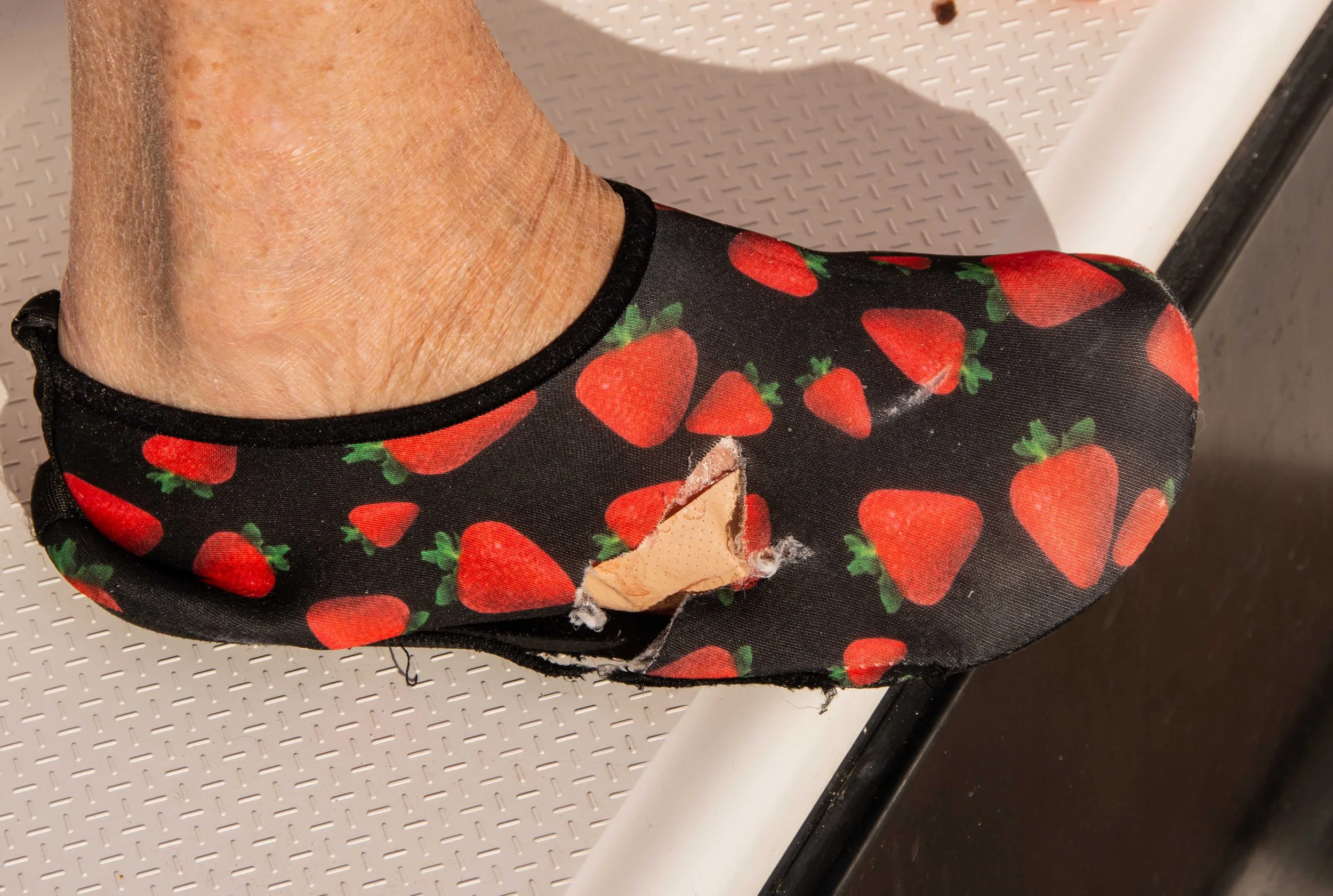 Photo 9. Ursula’s shoe sliced open showing just how lucky she was. We already had a Band-aid in the wound.