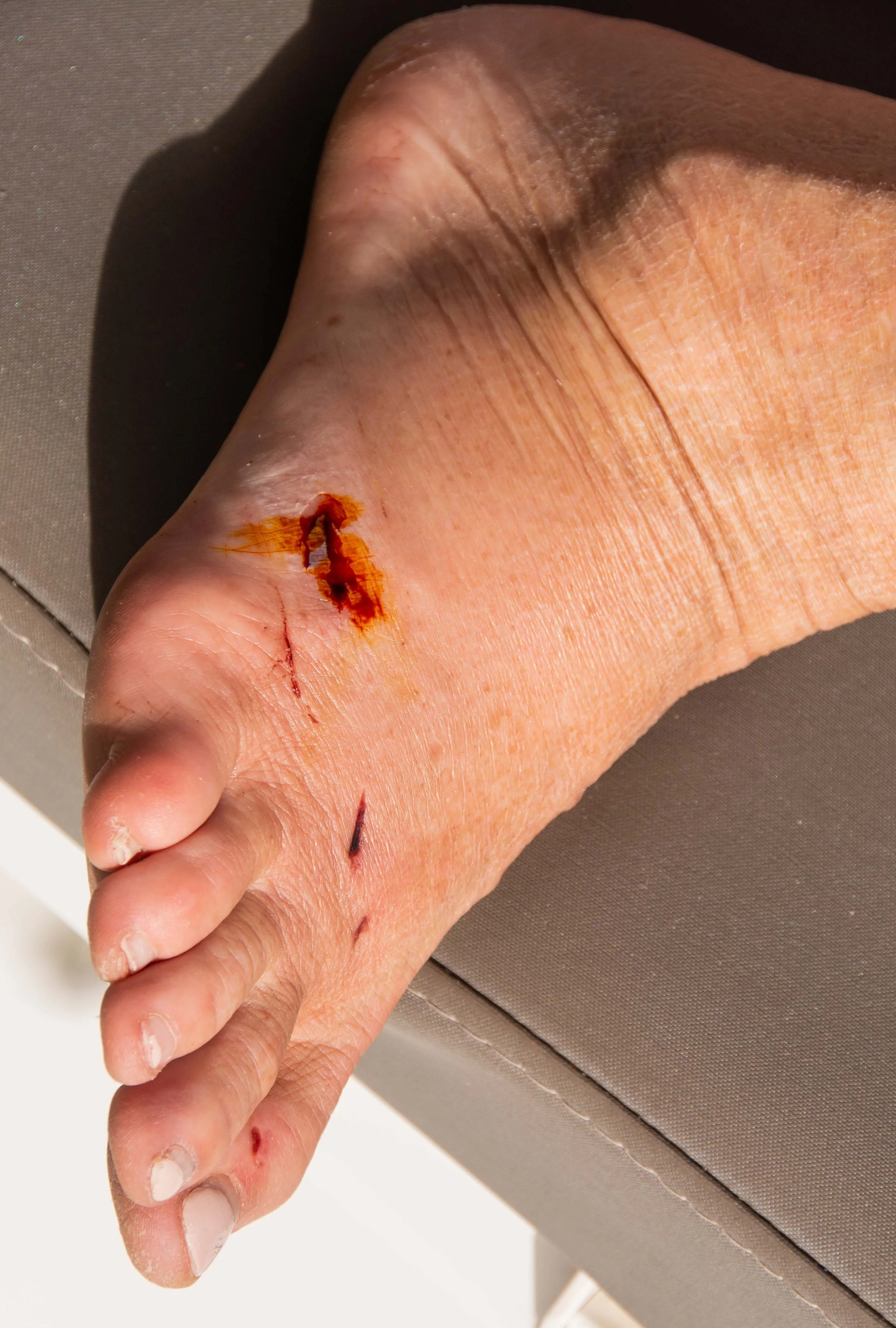 Photo 10. Three nicks across her foot. Another cm and !!!