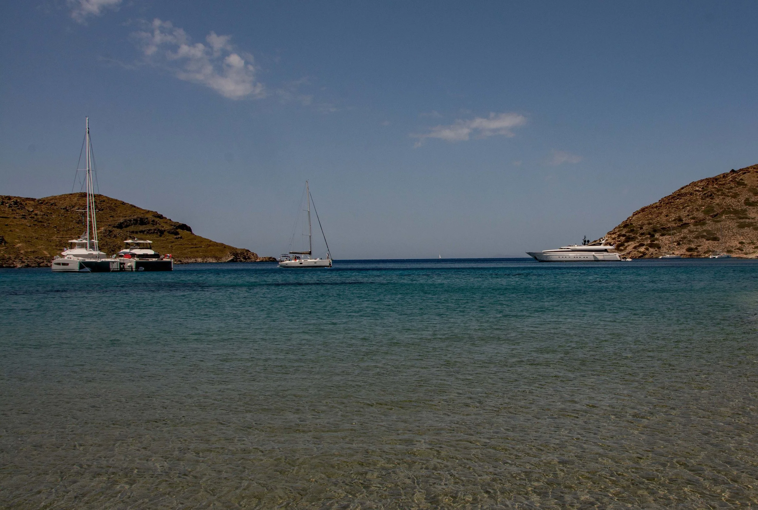 The catamarans on the left are of similar design to the Wild Baleine, the mega-yacht on the right is one of several oligarch type vessels we saw in every port. The beach of the bay has a hot spring and some of us spent the day relaxing and swimming.